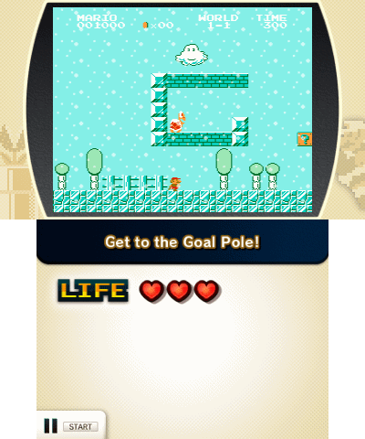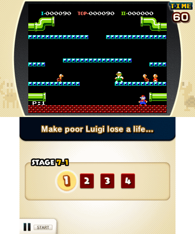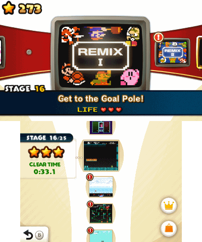 You'd think Ultimate NES Remix would be my favorite game on the 3DS. I like retro games; this is all about retro games. I'm allergic to long games; this breaks games up into 30 second chunks. I like Dr. Mario; you can play Dr. Mario. Shit, I've spent other reviews on here evangelizing RetroAchievements, where the goal is similar in rewarding you for deep diving into and getting good at old-school vidya. That's only taking on one game at a time, though. To be completely fair to Ultimate NES Remix, I definitely have gotten lots of on-and-off play with it since installing it to my system NAND, and it's a cool idea with good execution. It's more of my own blind spot for the games of this era that keeps me muted on it. Ultimate, like the NES Remix games that preceded it on the Wii U, train you in various NES games through short missions—completing stages in Super Mario, defeating enemies in Kid Icarus, boxing your wiry ass off in Punch Out!!. Your completion time gives you stars, which in enough numbers grant access to Remix stages where these games get shaken up in bizarre fashion. Mario now lives in a slippery ice world, or the stage is invisible. Link rescues Pauline from Donkey Kong instead of Jumpman and still can't jump. Kirby can't exhale. It's quirky, it's clever, the emulation is spot-on, and provided you like the game you're playing already, like I did with Dr. Mario and Balloon Fight, you'll go through all the stages quick. "Provided you like the game you're playing" is the load-bearing phrase there. If you think Donkey Kong is a clunky mess where the game is only difficult because of the asshole jumping mechanics, NES Remix will not change your mind. If you find Zelda II dull as shit, NES Remix won't make it sparkle. This all might sound obvious, but when a game you already don't like goes from "dogshit unfair physics and enemies" to "dogshit unfair physics and enemies but now you can only see what's directly around you", you'll be skipping over large chunks of content (and the reward for completing everything isn't all that great anyway). NES diehards will be a pig in shit with this, but everyone else might be better off sticking with the Virtual Console releases of their favorites.