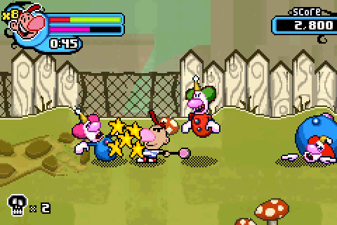 For those not up on their 2000s Cartoon Network shows, The Grim Adventures of Billy & Mandy is a pretty twisted grossout humor cartoon featuring an idiot boy, a coldly sadistic girl, and the Grim Reaper who's their friend forever (them's be the namesakes!). I don't know how much the show would do for me as an adult, but the glimpses of it you see through the GBA beat 'em up of the same name definitely amused me. I was surprised revisiting this one! I remember always appreciating how smooth and easy to play it is, but despite not being very deep, even as an adult who watched the show as a kid, it's not bad for a bit. Mojo balls—artifacts that cause unspeakable evil in people—are bled out into the world, and it's up to the trio to retrieve them. The control scheme is good, with both buttons used to attack, the right shoulder button to jump, and the left to initiate a devastating temporary mojo attack on the waves of killer clowns, pumpkin bats, pogo jumping army men, kangaroos, and God knows what else comes after you. The tutorial onramps you quickly, and the story is—well, over in about a half hour, really. Surprise, an episodic dark comedy for kids doesn't power the story mode in a Double Dragon clone all that well. Where what fun Billy & Mandy does have in store really lies is in the mission mode, which is also necessary to unlock Mandy and Grim as playable characters. It's your typical fare to kill a wave without being hit, get to a mojo ball quickly, or locate slices of pie in a level, but it's fun in short bursts, and they can get kinda challenging. The animation and graphics are very smooth for the GBA and carry a lot of the personality of the show in them. It's true that it doesn't last long and it's a pretty dumb button masher, but it's like getting mad at Top Gear for not having sex appeal. It's a car show, and it's not Jeremy Clarkson's fault he looks like that.