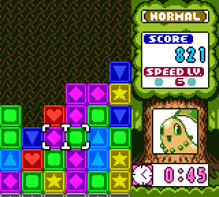 Given that I've officially hit the point where I can play a game of Tetris DX for one million years, I've started looking at what other Game Boy puzzle games I can sink too much time into. Imagine me booting into Pokémon Puzzle Challenge only to discover I already played this a lot as a minigame in Animal Crossing: New Leaf! Both are actually descendents of a SNES block-swapping game called Panel de Pon, or Tetris Attack internationally, because Nintendo is good at having an idea and then just reusing it twenty times. All Panel games involve swapping blocks horizontally, trying to make a row or column of three or more of the same color of block. My brain doesn't see matches as easily as it does openings in Tetris boards, so I suck at it, but it's still a good time. Puzzle Challenge's Pokémon theming is effectively (absolutely adorable) set dressing, as your party of the Johto starters and Pikachu mostly count as lives in the "story" mode where you "battle" gym leaders and the Elite Four, or as Professor Oak explains the game modes to you. I feel like Puzzle Challenge is rather easy unless you intentionally crank the speed up (or force more rows on-screen with B) to make it more difficult. Like I said, I'm dog ass at this game, so maybe that's alright. While being a Pokémaniac isn't necessary to enjoy Puzzle Challenge, the visuals and music are lovely and carry that warm, wistful Johto charm on them. With lots of mode variety, score and progress saving, and good vibes all around, maybe it's best Nintendo didn't tamper with a good thing after all.