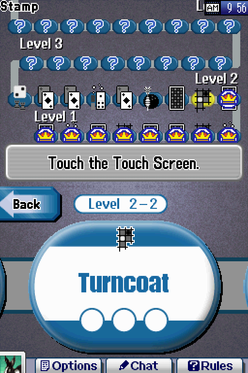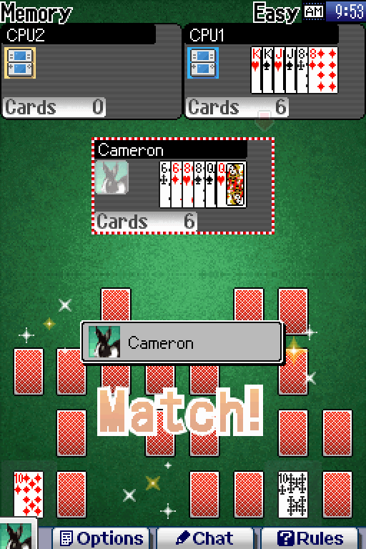 Of course one of the finest demos for your shiny new $150 3D-capable Nintendo DS is, y'know, card games. It actually makes more sense when you consider the touchscreen, but either way, Clubhouse Games is a classic whether you like it or not. Imagine yourself a cozy little treehouse right at the start of autumn stacked up with tabletop games inside, 42 in all. Hearts, bridge, blackjack (get it twisted), chess, chinese checkers, solitaire, mahjong solitaire, hangman, Uno, bullshit, asshole (the game might call some of those something else)—even if you don't recognize what the game calls them, you know them, and it's a good time having them all in one place. Games are customizable in rules, number of players (CPU players are your typical opponents, but there is local multiplayer), and even the table surfaces that you play on and the look of the cards. Games are quick to get underway, come with detailed instructions if you're unfamiliar, play nice with the touchscreen, and complete within a few minutes, so like all good DS games, you can bounce between games whenever you have 20 minutes to kill. Win and loss statistics do save after every game, and various little cute MOD-ish chiptune jazz tunes play as you run up gambling debts in Texas hold 'em or fail at chess. It's a really well thought out package. The variety in games does a lot to help you not get bored. Though they don't call the licensed games Battleship or Uno, what you get is basically the classic board games, just in game form. They're nice to have! (If you're wondering if there's any great duds, the "action games" like bowling and darts aren't brilliant to control with the touchscreen, though shooting pool feels great.) To increase replayability further, there's mission and "stamp" modes that let you unlock more games, additional tables, even another soundtrack. If you feel a little aimless from all the cozy timewasting, rest assured you have plenty to neurotically complete here.