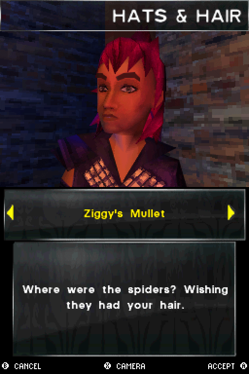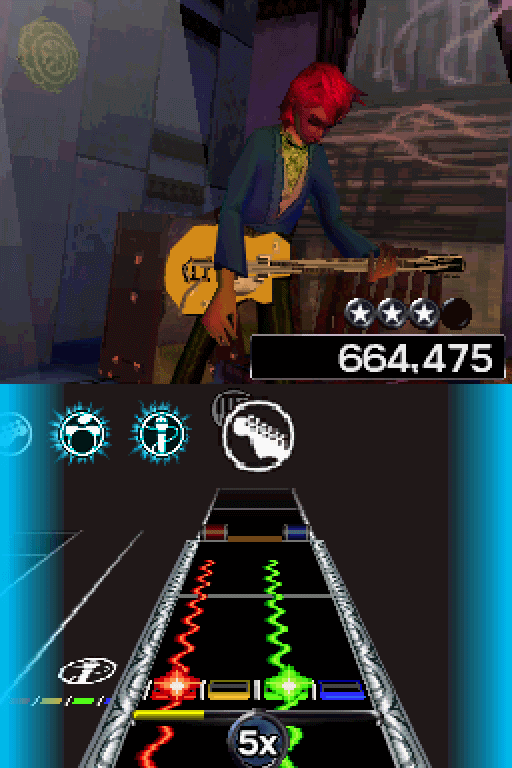 Listen, I've played just about all the Guitar Hero and Rock Band out there, with and without the Fisher Price instruments, but Rock Band 3 for the DS is up near the top. Do not mistake this for a cut-down cast-off port of a game that "needs" the drums and guitars—Rock Band 3 DS has you playing the whole band, tippy-tapping the D-pad and buttons for one instrument before switching to another (a la Amplitude), and this is the most polished, flow-inducing, manically satisfying of all the portable Rock Bands that fit that description. All the little nitpicks have been filed down, and you get all the band customization, play challenges, and even Pro Mode of the console versions. You can even still play in a band with multiple DSes. The Rock Band 3 DS engine feels immaculate. The note scroll speed is just right. The notes are easy to read regardless of what crazy patterns they throw at you. Whereas the charts in Lego Rock Band DS and Rock Band Unplugged were a bit messy and awkward, damn near every pattern you play here is perfectly alternated between the thumbs. Adding onto those previous games are three-note chords and sustains with extra notes on top of them (say, for harmonies in songs, or complex keyboard parts), adding lots of tricky satisfying bits as you swap around and try to keep the whole band together. You don't even have to fit activating Overdrive between your notes—activating will also play the note you activate on. How's that for polish? Obviously they couldn't fit the entire 83-song setlist onto a DS cartridge, but you do get 26 here, and they sound great. There's a definite bent towards the pop rock and indie end of the setlist (not complaining), but your Hendrix, Ozzy, Doobie Brothers, Joan Jett, The Cure, and Yes help to round out especially the higher difficulty songs. Sadly, they are more censored than the console counterparts to attain an E10 rating, so Smash Mouth doesn't want to buy the world a toke here, and Rilo Kiley can't tell of the touching leading to sex. Alas. I understand why, but it really is a shame you only get so many songs, because Rock Band 3 DS is just about the most mechanically satisfying game I have ever played. Someone let me know when they get customs working and I'll bake you a full new setlist. That's a promise.