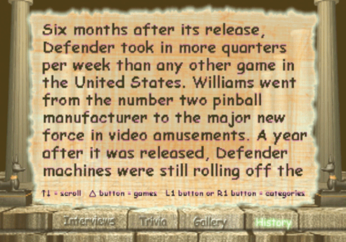 As an arcade-loving small child with very few opportunities to actually play arcade machines, these kinds of comps were my best friend, and Midway Arcade Treasures is as strong as they come. This rounds up all the heavy hitter golden age arcade games from Williams, Midway, and Atari through pitch-perfect emulation. Robotron: 2084 (and sequel Blaster), Defender (and sequel), Joust (and sequel), Smash TV, Tapper (root beer, not Budweiser), KLAX, Rampage, Gauntlet, Spy Hunter, Marble Madness, Paperboy, the list goes on... These games were noted for their rock-hard difficulty and technological innovations, from unique control schemes to primitive 3D to speech synthesis. Whether or not each game is any fun is, of course, going to be up to your tolerance for those things (or your tolerance for the driving games inexplicably using the right analog stick for acceleration), but at the very least, the classic Williams set of Robotron, Defender, and Joust are hard to argue with. Each game is customizable in controls, number of lives, difficulty, and number of players, so if you've got three in-person friends and a multitap (lucky), yes, four-player Gauntlet is here for all of you. This game actually outdoes Namco (remember, the originators of the arcade compilation) by including not just a much larger variety of games, but also...a museum! Yes, while they're not amazing quality visually, and not every game has the same breadth of content, there are actual developer interviews on video, written histories, production art, and sell sheets for each game, things Namco stopped including in their comps by the 2000s. As such, Midway Arcade Treasures isn't just great to play, it's also a neat look into arcade history—provided you can tolerable the use of Comic Sans for all the menus. (Why?)