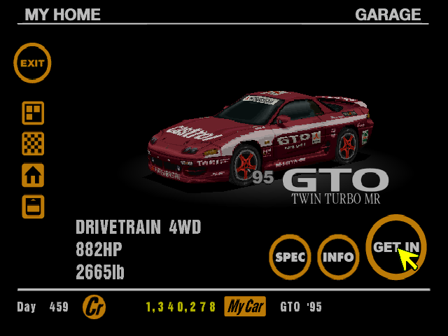 The 1995 Mitsubishi GTO. I can divide my time with Gran Turismo into before and after I found this car. Before, I was lost. I could never seem to get an edge regardless of how much money I dumped into my cars. Races were hard. Physics were wonky. Even the computer drivers regularly seemed to eat shit on jumps and funny turns. I started skipping the "yes you do this before every single race" qualifying laps the second game mercifully dropped because I never did better than last place anyway. Afterwards? You can win most of the cups with this one car. Perhaps it's a bad thing to be able to cheese things with one car, but it wasn't free to get there! There's a lot of First Game Syndrome in Gran Turismo. As tradition, you start with your license tests to unlock cups. The game challenged me to time trial Special Stage Route 11 (the most angular city course ever designed for a game) in a slippery-as-fuck TVR Griffith without crashing, the bronze time limit set one second below sane by the perverted sadists who came up with it. The game lets you change everything from camber angle to gear ratios before every single race, and I found myself toying with stabilizers and brake controllers like I knew what I was doing, but once I got that GTO just how I liked it? Huge leads and wild riches awaited. In fairness, the sequel has just as much early game tedium without a setup. The fun has always been in the freedom to experiment with tires and turbos, never the grind to afford them. Once you've got money and a good car, feeling the noticeable difference in handling in every tune and tweak is just as addictive as in its younger sibling. The music's great as always, the courses still attractive and challenging today, and unlocking the gorgeous 60FPS GT Hi-Fi mode is worth it all its own. I'd still give the nod to 2 for the better physics, progression, car and track selection, but this first one grew on me big time. After I bought the GTO. (If you're looking for the fastest way to make money in the game, enter the Dodge Viper in the Normal Car Cup. Don't tune it, that disqualifies it. Just buy the RT/10 for 70,000 credits or so and watch as you can make 400,000 in a half hour. I can't drive for shit and I did it, so what's your excuse?)