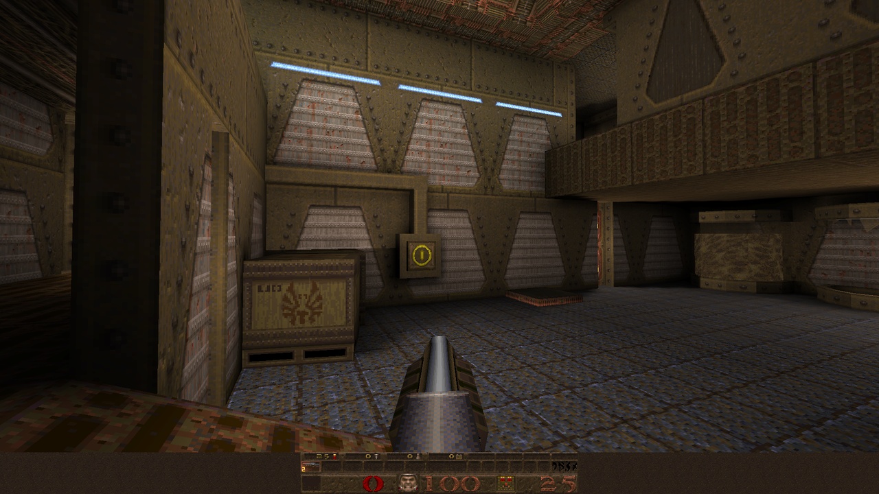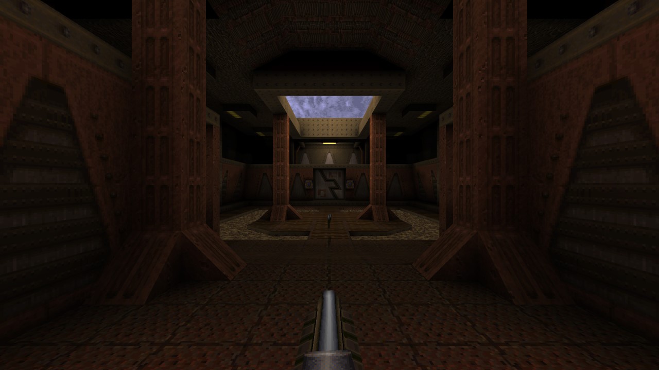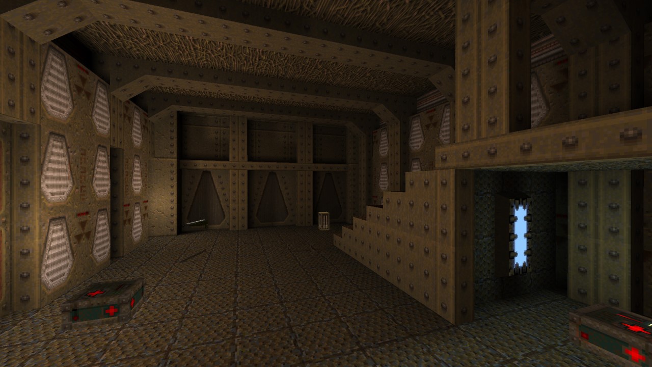 [12:27 PM] Cammy: so i'm trying to emphasize "agency" with episode a [12:27 PM] Cammy: that's the whole point of it [12:27 PM] Cammy: here's the spawn area and your first taste of that [12:28 PM] Cammy: the elevator is directly ahead, but if you take it, you won't be able to play on nightmare [12:28 PM] Cammy: you'll need to go down the stairs [2021 note: to the far right in the screenshot] to trigger the passageway with the gold keycard [12:28 PM] Cammy: and the gold keycard door behind spawn leads into the nightmare wing [12:28 PM] prengle: Clever [12:29 PM] prengle: But I'm that kid who types in skill 3 [12:29 PM] Cammy: sure you do [12:29 PM] Cammy: but some of us are cut [12:29 PM] prengle: It's natural beauty [12:31 PM] Cammy: anyway i like big spawn maps and i want this to be a bit explorey