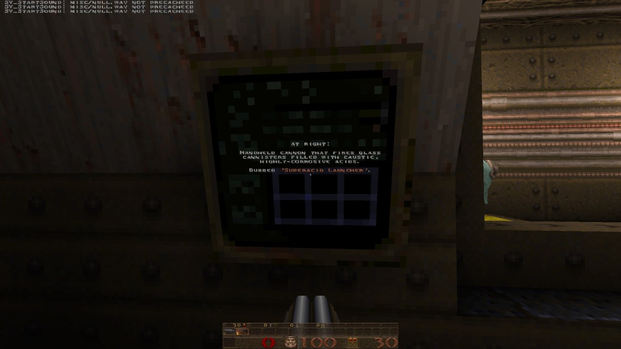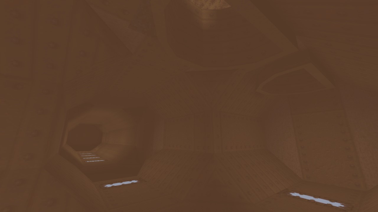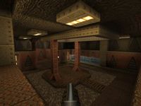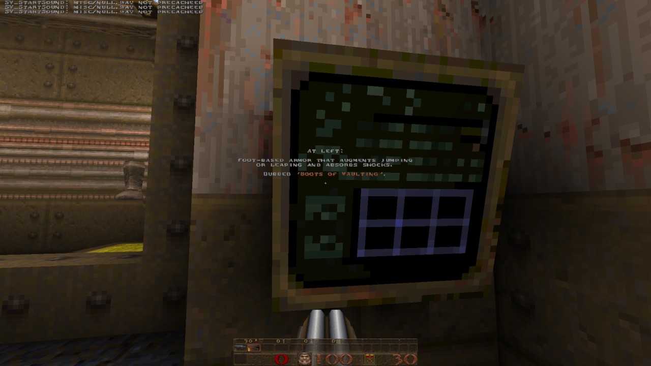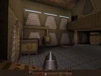After some attempts at adding off-limits areas for decorative purposes (for "depth" reasons and to make the base seem bigger), this one got dropped. I did return to it briefly after I retooled Episode A into more of a cut Quake content mod (you can see id's unused boots model in the shot below, which I implemented as jump boots in QuakeC, and there was code for a proper healing pool too), but I never finished any of it, and the boots and code are now lost, most likely.