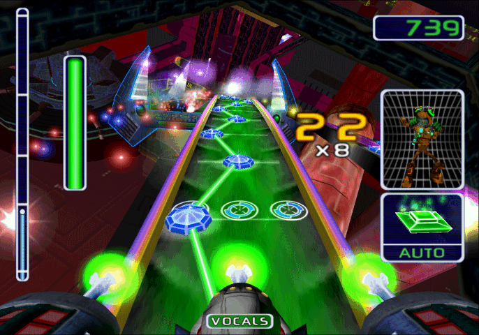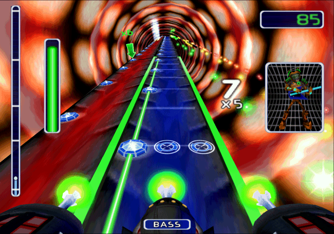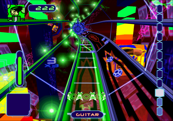 FreQuency carries the distinction of being the first game legendary rhythm game developer Harmonix tackled. Here's the gist: You're a "FreQ" flying through a tunnel of music. Each side of the tunnel is plastered with gems that sync up roughly to the rhythm of one instrument in the song, the difficulty determining the note density. Press the corresponding shoulder buttons as each of these gems pass the target, and if you can keep up successfully for two bars, that instrument will play itself for a few. Spin the tunnel, move to another instrument, and repeat the process until the end of the song. At its best, FreQuency is a hypnotic game. Your goal, ultimately, is to play well enough to rebuild the mix of the song. The "arenas" outside the tunnel can be chosen, and they're quite the neon light show, for better or worse. Powerups help you capture tracks, double your score, and keep your multiplier going in case you screw up. The soundtrack is also fairly good, though how much you'll like it depends on if you've ever heard of The Crystal Method, Curve, or Powerman 5000. (And some of the quirkier and harder tracks are outright HMX inventions!) Those things also massively limit its appeal though; it can be hard on the eyes, and you won't see or hear much that's terribly human during gameplay. It doesn't help that the timing window per note is extremely small, and with emulator lag, the game is nearly unplayable on the harder difficulties. Paired with all tracks muting at the start of each section, thus killing your groove, and I can see some people finding this game downright frustrating. I like it, though. It's flawed, and the sequel works far better in every way, but there's a lot of personality here and not a whole lot like this.