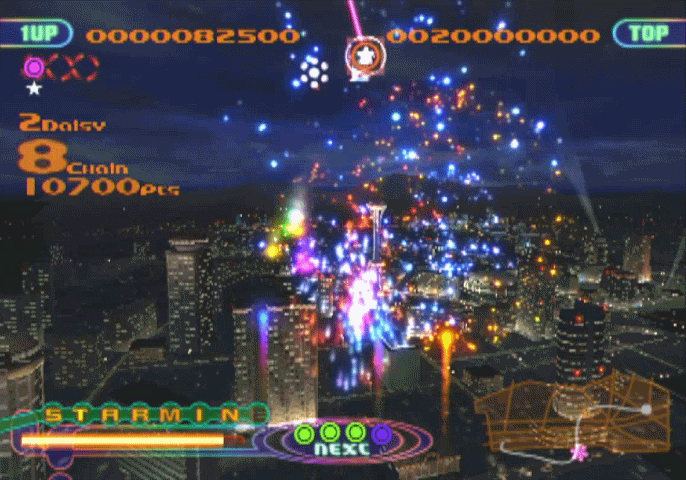 You gotta appreciate just how much people wanted the PS2, even with its pretty meager launch lineup. Fantavision is maybe the most emblematic of the lot, and reviewers at the time called it for what it is, a tech demo for the PS2's much-touted 3D particle effects. Yes, it's a game built around a single visual effect, that the dazzling fireworks displays are entirely polygonal, not one sprite in sight to make them! It's a shallow effect, but undeniably very pretty, especially during the replays. I've heard the two-player mode in Fantavision majorly improves replayability, but alas, I don't have anyone to come over and help me test it. Fantavision is effectively a sensory toy version of Missile Command. The game presents you with a slew of fireworks in rounds, each with different shapes to them, and you use your cursor to select three or more of the same color, detonating them with the circle button. If a detonated firework spills onto an undetonated one of the same color, it'll detonate that one with it. This leads to the chain gameplay the game emphasizes. Don't explode a firework, it'll fade out and take some of your energy bar with it. Enough chaos will eventually lead you into a "Starmine" bonus round where you get a spew of one or two colors of firework, meant to emphasize huge chains. For as much as I've heard Fantavision called a puzzle game, you can boil things down to "select all fireworks on screen, detonate them, and repeat with whichever are left plus any new ones". Not very puzzling. Makes my hand hurt from button mashing. The big reason why I keep a save of it around is the replay function, where the game will replay your performance on a stage from different camera angles, letting you appreciate the visuals and the strange stage designs (hint: you're going to space) through various filters. Seriously, this game does look hugely trippy. For someone who occasionally streams around the Fourth of July and New Year's, it makes for some terrific visual noise during intermissions. As a game, eh.