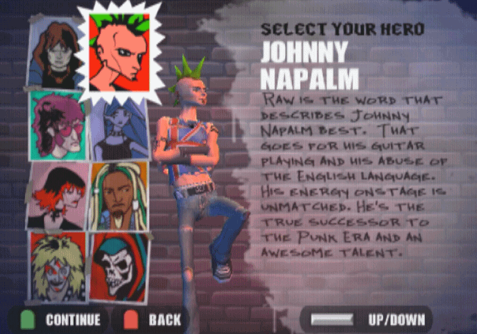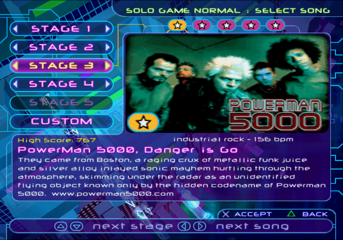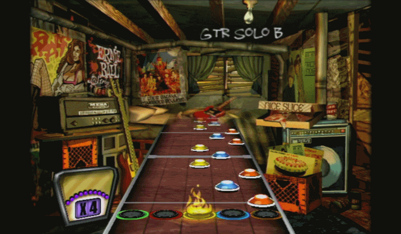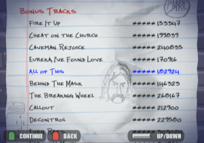 Probably the most impressive thing about Guitar Hero is how much Harmonix had figured out right from the beginning. Anyone who started with any later game in the series can sit down with GH1 and play it—at least in theory. GH1 has gained a reputation among five-fret rhythm game enthusiasts for being a lot more difficult to play than later entries, and I'd say it depends on how you look at it. Technically, there are many little details about GH1 that make it more annoying than it needs to be, but the songs and charts are actually a lot easier than later entries—and no matter what, this is still Guitar Hero, and that's still wonderful. If you're somehow unaware, you use either a plastic guitar or the DualShock (which doesn't require you to strum) to "play" the guitar part of each song, and it really is twitchy score attack ambrosia as you try to do better at each song and increase your scores. On the surface, the engine is fairly similar to GH2, but there's definitely enough differences (the notoriously complex HO/POs that basically require you to strum each note, the lack of feedback on combo break) that I would not call GH1 my favorite to play. There's also plenty of undercharted songs, even on Expert, and Hard difficulty is a meme that you might as well skip entirely. Aside from the bonus tracks, all songs are soundalike covers, and assuming that doesn't turn you off on the spot, they really do a great job on 90% of these covers, especially in imitating more distinctive vocalists like Ozzy Osbourne. It's the songs that are the strongest part here, everything from Joan Jett, Deep Purple, White Zombie, Helmet, Stevie Ray Vaughan, and Queens of the Stone Age, and the bonus tracks from Harmonix's own bands and Boston's finest are especially fun if you're an indie head like I am. A great beginning was charted here, but playing GH1 is as much a reminder of how many improvements the sequel made as anything else.