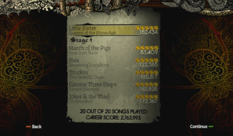 These Rock Band Track Packs were a real joy to have as a young marf, stuck on last gen hardware with no way to play all those tons of cool DLC songs the 360 and PS3 kids were getting. Each one is a set of twenty DLC tracks, wrapped up in a quick standalone setlist that doesn't require the original game to play. This first Track Pack was actually exclusively released for the Wii and PS2 (later ones would be released for all four systems, with the songs exportable to the full game for the 360 and PS3), demonstrating the concept. The setlist is mostly wall-to-wall huge tunes, an eclectic mix of tracks from pop punk (blink-182's "All the Small Things", Paramore's "crushcrushcrush") to 90s alt (Oasis' "Live Forever", Stone Temple Pilots' "Interstate Love Song") to some golden oldies (David Bowie's "Moonage Daydream", Lynyrd Skynyrd's "Gimme Three Steps") to much more recent rock (Queens of the Stone Age's "Little Sister"—not to mention Wolfmother's notoriously difficult "Joker and the Thief"). It's a fun set! The only real letdown is the Grateful Dead track "Truckin'"—overly long, like a lot of the Dead's tunes are, I wish we got "Casey Jones" from the same pack instead. This disc is built on the same last-gen engine as the main game on PS2, so do know you're still getting the video backgrounds, shitty Practice Mode, and limited Guitar Hero II-like tier progression system with no ability to play singleplayer bass as it. What I find most interesting were the minor graphical and technical improvements Pi Studios made to this port over Rock Band PS2, notably in the instant song restarts over that game's loading-delayed ones. Very nice. This is a highly playable set (I gold-starred most songs basically first try) of really good tunes, and that's all there is to say about it. (This review equally applies to each successive Track Pack. Check out the setlist, and if the songs appeal to you, give it a go. They were on autopilot for these, understandably so.)