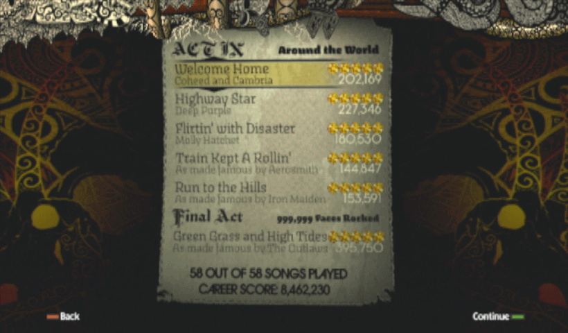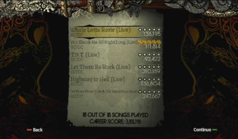 While the run of Track Packs were originally meant to give Rock Band DLC to the consoles that couldn't get any, this one's an odd duck: effectively a playable version of AC/DC's *Live at Donington* DVD, totally exclusive to this disc! Actually the first time 17 of these 18 tracks have ever appeared in a rhythm game, it seems hard to pass up playing "Dirty Deeds Done Dirt Cheap" and "Back in Black" and "Thunderstruck" in Rock Band—but hold on. There are caveats that I think pretty universally temper how much excitement you can expect to have for this disc. For one thing, being a live set, there's lots of, well, liveness going on. Several of the songs are extended with long breaks where singer Brian Johnson plays the crowd, or long intros meant to build anticipation. These are fine enough in a live setting, but kinda suck when you're waiting a minute or two for your instrument to come back in, or playing a really dull drum part in a break. These songs also have the longest Big Rock Endings (where the only goal is to smash on your controller for pounts) of the entire series—some go for at least half a minute. Of strumming and mashing buttons! It's a little tiring and dull. Brian Johnson's gnarled space alien singing also probably won't appeal to folks looking for an AC/DC greatest hits in Rock Band, but I didn't mind all that much personally. That all said, this isn't a bad set to go through if you're a rhythm gaming fanatic or you like AC/DC. It's built on the first Rock Band's engine, so if you're okay with missing hyperspeed and the like, it plays perfectly well. The songs are still catchy and definitely fun in casual play, even if their extended forms make any kind of score grinding an exercise in tedium (gold stars hinge entirely on being perfect on the easy songs or hitting the absurdly difficult solos on the harder ones). Thoroughly flawed but fun in spite of itself, this is the rare case of a wonky game that's wonky for reasons that seem to be mostly out of the developer's control. Harmonix did their usual good job transcribing these songs, it's just that what they're transcribing is a nine minute long rendition of "High Voltage".